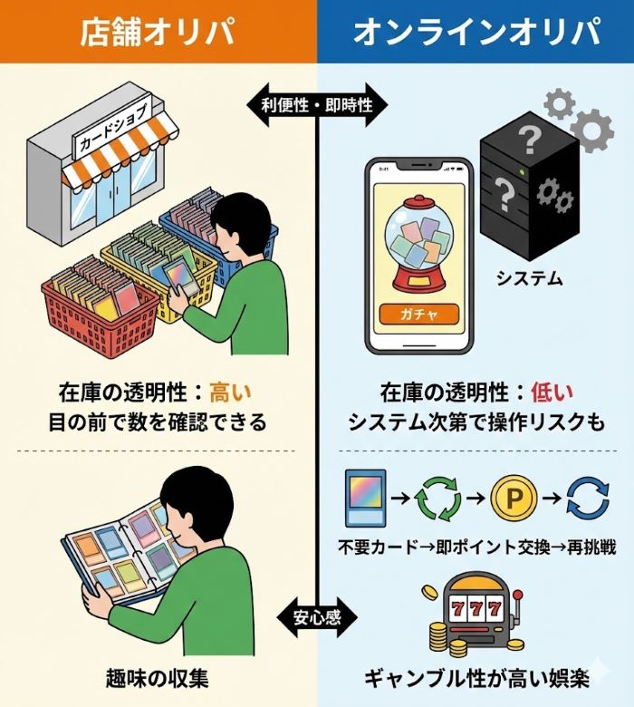 実店舗のオリパとの最大の違いは、「在庫の透明性」と「利便性のトレードオフ」にあります。