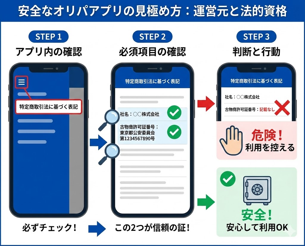 結論から言うと、アプリの「運営元」が誰であるかを特定するのが最も確実な防衛策です。信頼できるサービスは必ず「特定商取引法に基づく表記」に社名が明記され、公安委員会からの 古物商許可証番号 も記載されています。番号が見当たらない場合は、利用を控えるのが賢明です。