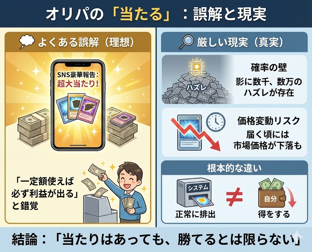 オリパにおける「当たる」とは、統計学的に低い確率を引いた結果であり、決して「一定額使えば必ず利益が出る」という意味ではありません。SNSで見かける豪華な当たり報告は、その影に数千、数万のハズレがあることを忘れてはいけないのです。