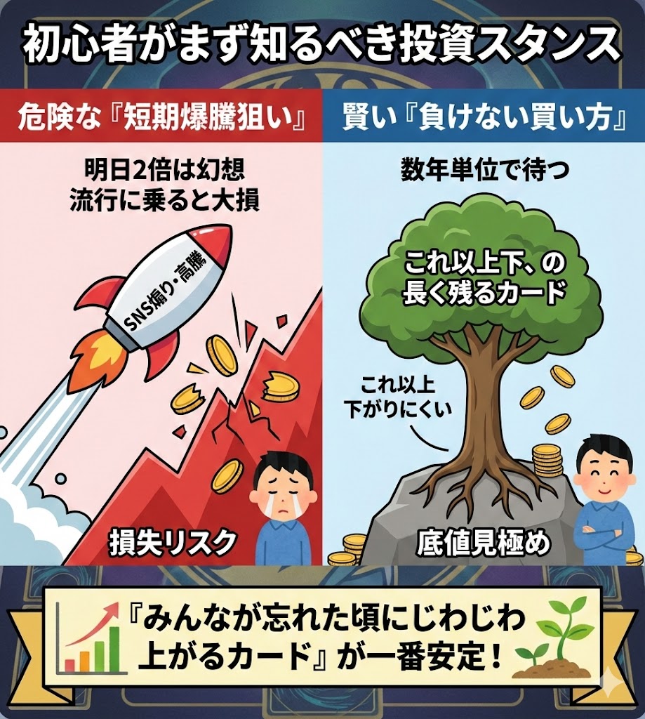 僕も最初はSNSの煽りに乗って失敗したことがありますが、結局は「みんなが忘れた頃にじわじわ上がるカード」が一番安定して利益を運んでくれました。