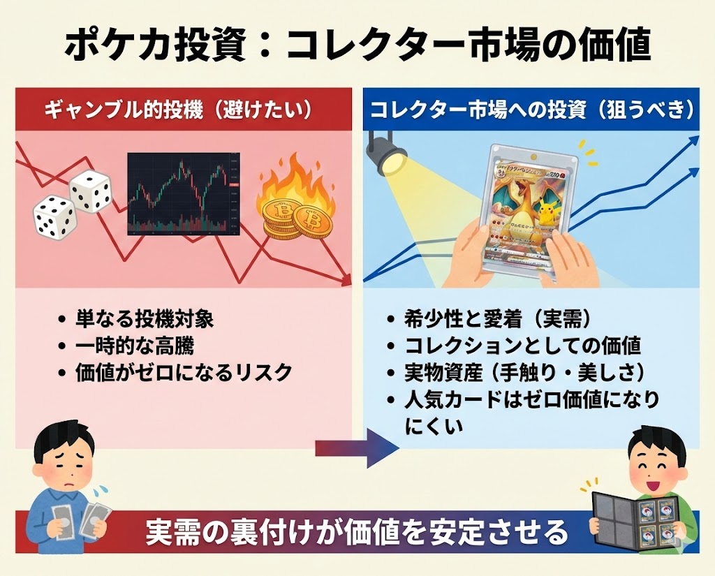 実は、ポケカ投資はギャンブルではなく、正しい知識を持って向き合えば立派な資産形成の手段になり得ます。高騰しているカードを追いかけるのではなく、価値が落ちにくいものを「正しく選んで待つ」ことさえできれば、初心者でも失敗のリスクを最小限に抑えられます。