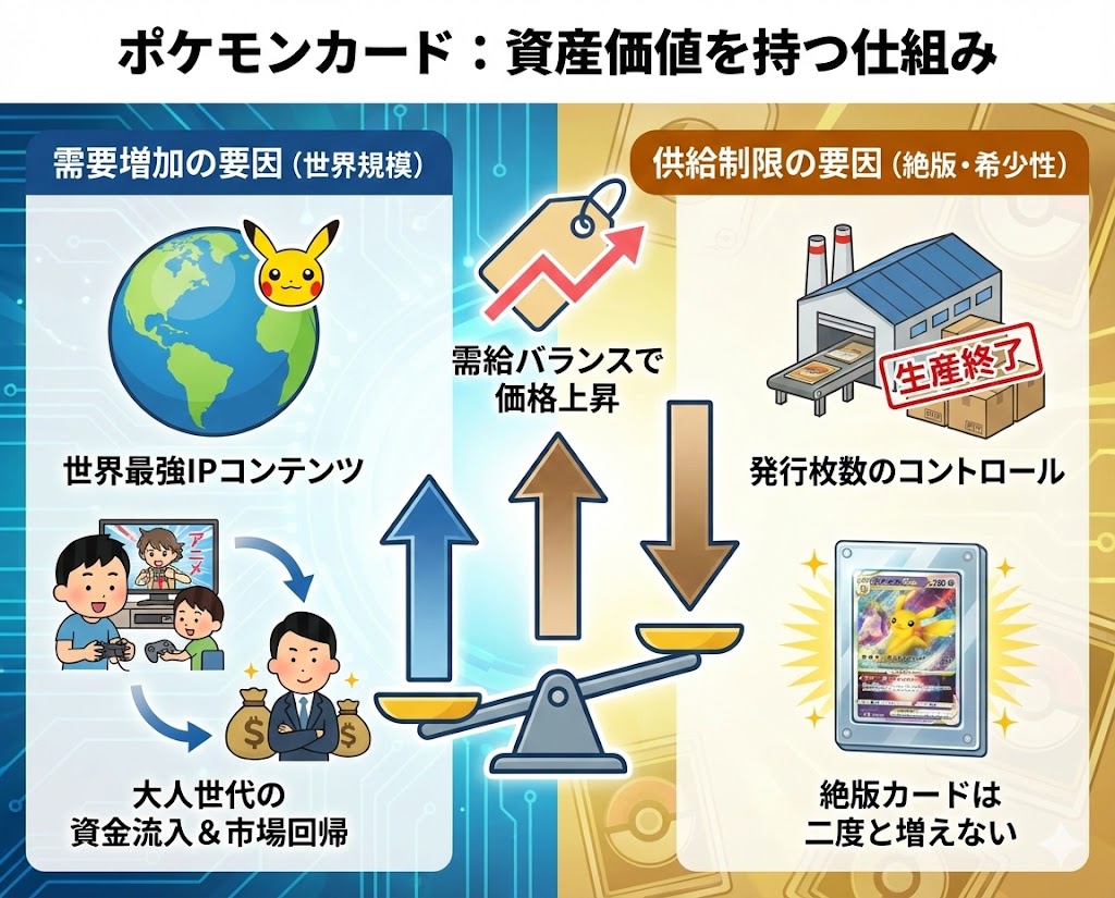 ポケモンカードが一時的なブームに終わらず、資産価値を持ち続けているのには明確な仕組みがあります。