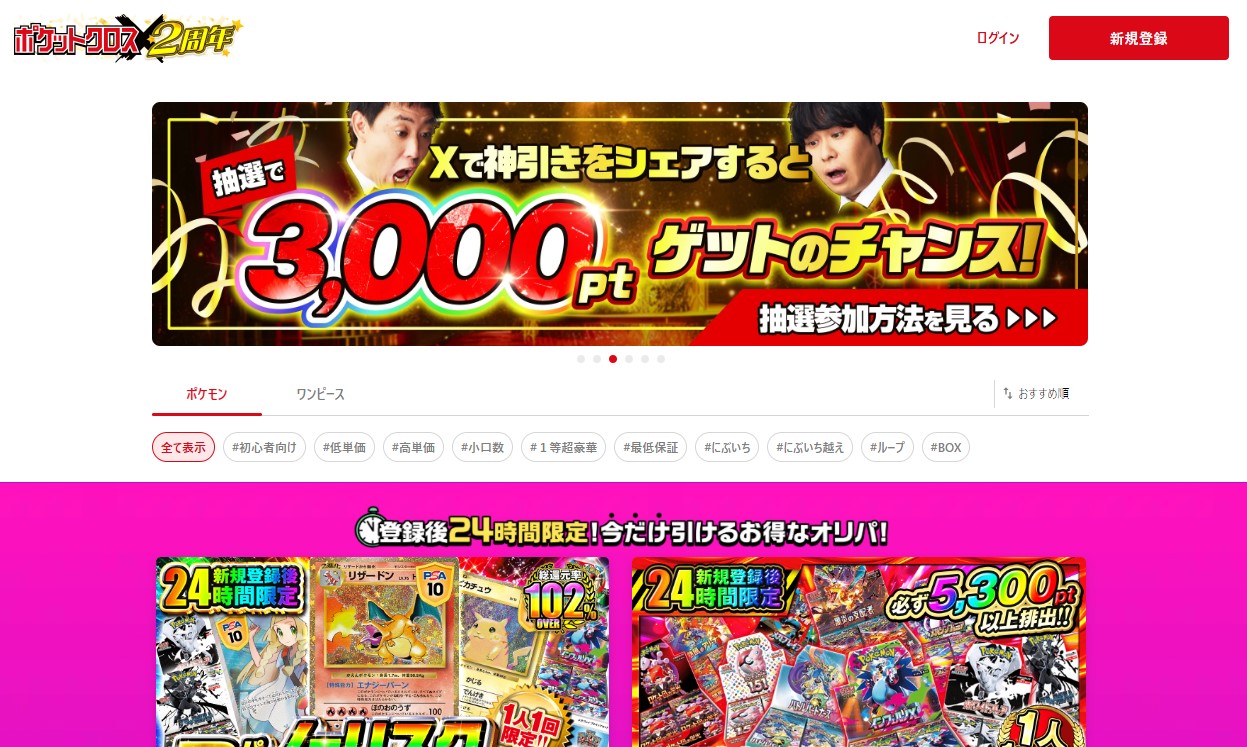低リスクというより「ノーリスク」で引けるのが、ログインボーナスや無料ポイントで回せるオリパです。